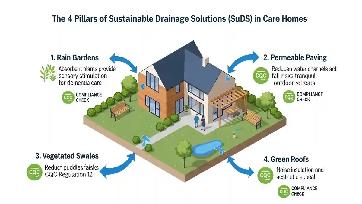 The future of sustainable drainage solutions CQC care home design is the integration of SuDS (Sustainable Drainage Systems). In Ditton, Policy EN18 of the Local Plan encourages SuDS to manage surface water runoff, which often plagues the surrounding area.